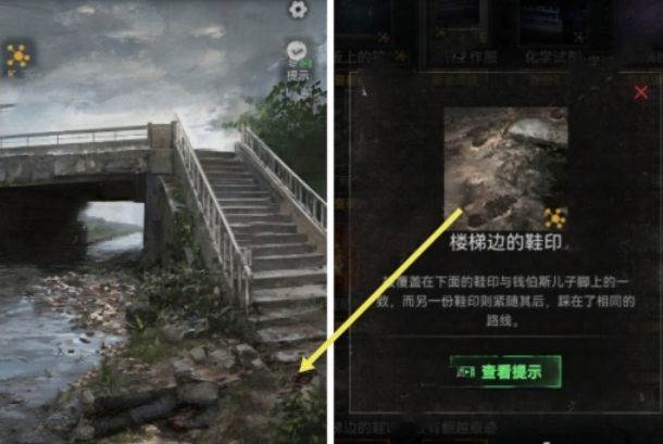 33、点击桥洞,然后点击脚印,得到线索桥洞下的脚印。