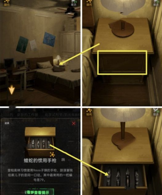 18、打开抽屉,点击里面的枪,得到线索蝰蛇的惯用手枪。