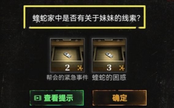 35、在疑问蝰蛇家中是否有关于妹妹的线索?中填入线索帮会的紧急事件、蝰蛇的困惑。