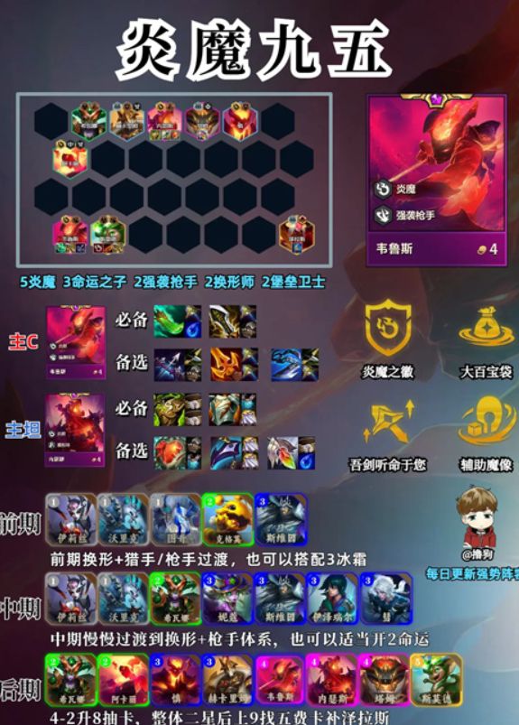 在也就是云顶之弈中,各种九五阵容都有着极高的强度。然而因为其成型难度大,需要极高的运营思路以及随机应变的能力,这种阵容虽然普遍具有拿第一的实力,但想要玩好却并不简单。如果只是知其然不知其所以然,那么很容易中道崩殂老八结尾。本期攻略,我们就来讲讲各大九五阵容中相对平滑的阵容——炎魔九五。