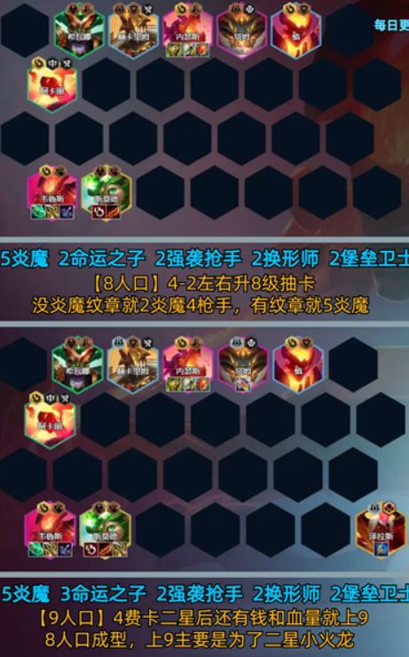 2、没有炎魔转不要4炎魔,就开4枪手,八人口把阵容抽全2星就有决赛圈实力,不要着急上九人口