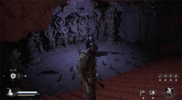 左侧的资源采集好后,我们沿着右侧上坡的路走上去,可以看到一座寺庙,在这里面有赤尻马猴二阶段等着我们,而且还有给我们葫芦进行附魔的道长,在我们打败赤尻马猴二阶段后,道长会交给我们新的法术-安身术。