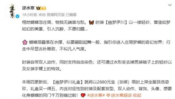 逆水寒会定期推出许多的时装,那么时装幽梦伊川什么时候上线呢?全新时装【幽梦伊川】将在2024年8月22日正式上线,一起来看看详细的时装幽梦伊川上线时间吧。