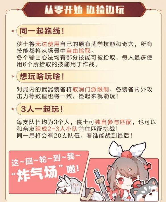 每支队伍均为3个人,侠士可独自参与匹配,也可以和亲友组成2-3人小队前往匹配挑战!同一局将会有20支队伍,看谁能战到最后!