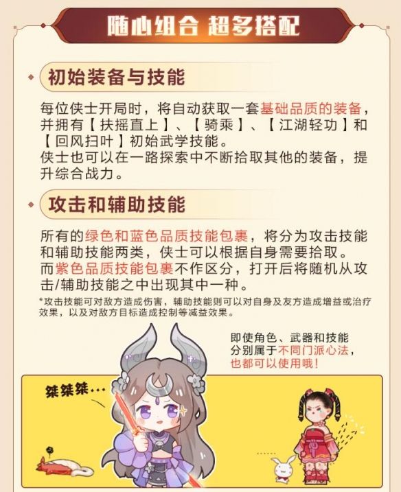 每位侠士开局时,将自动获取一套基础品质的装备并拥有【扶摇直上】、【骑乘】、【江湖轻功】和回风扫叶】初始武学技能。侠士也可以在一路探索中不断拾取其他的装备,提升综合战力。