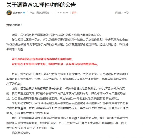 1、目前怀旧服社区对WCL的插件副本分数带来了非常多的不同类型的争议。
