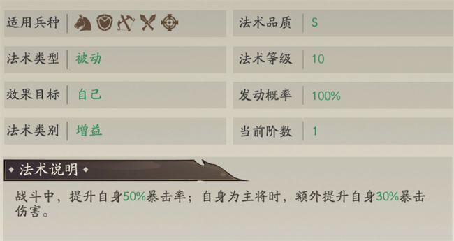 作为队伍中的全能辅助,固有被动法术“九曲葬花”可以提升主将的物理伤害,同时保障主将不受负面影响,为敌方施加控制,保障队伍的稳定出伤能力,配合法术“纵横捭搁”提升自身防御的同时代替友军成为攻击目标,保障双C状态的同时稳定触发固有法术。剩下的法术推荐选择“岿然不动”可以在战斗前2回合附加敌军群体畏怯(无法进行普通攻击)状态,第3回合恢复兵力最低单体血量,进一步保障输出环境。