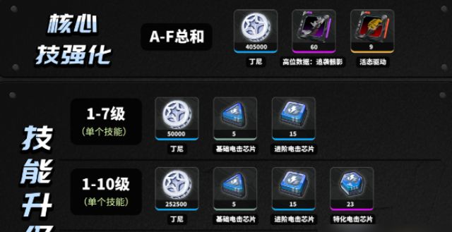 核心技能F升级需要:4腥风之握、30高维数据:凶刑讣告、20w丁尼。