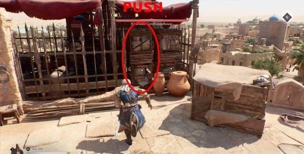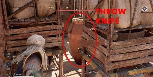 门外右侧角落有几个花瓶,用近战攻击打碎它们,花瓶后面的两个架子可以推开,将左侧架子往前推,右侧架子原地不动,然后从两个架子之间的开口处瞄准另一个花瓶,用飞刀打碎它。