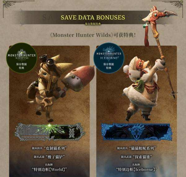 若满足以下游戏进度条件的《Monster Hunter: World》或《Monster Hunter World: Iceborne》保存数据被保存在用于游玩《Monster Hunter Wilds》的设备中,即可领取对应的保存数据特典。