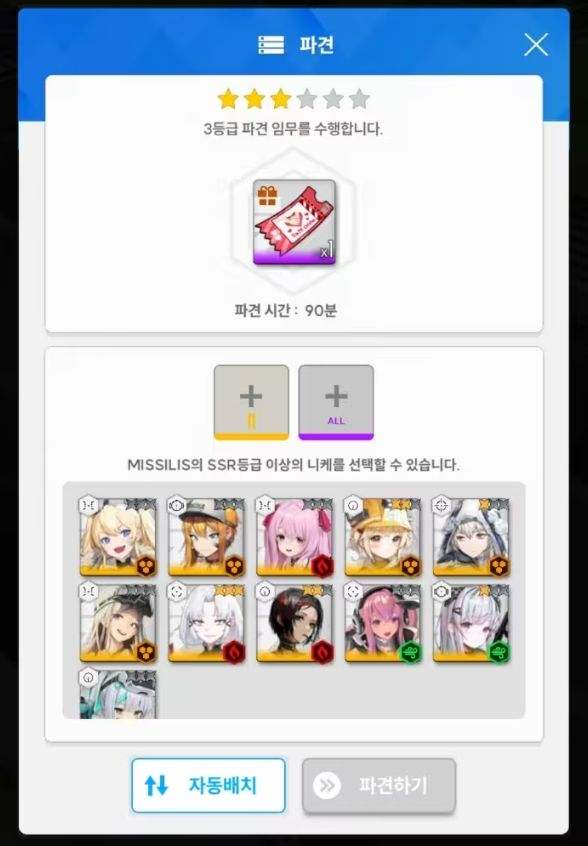 如上面的截图,必须派遣一个米西利斯 SSR 级妮姬 + 任何 SR 级或更高级别的妮姬,没有米西利斯的妮姬就无法发送派遣。