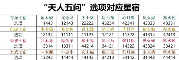 选择完天人五问后,系统会根据你的选择为你确定一个星宿。每个星宿有不同的名称和属性,想要一个名字听起来比较好听或更符合你角色的气质,可以参考天人五问后的星宿表格,选择自己喜欢的。