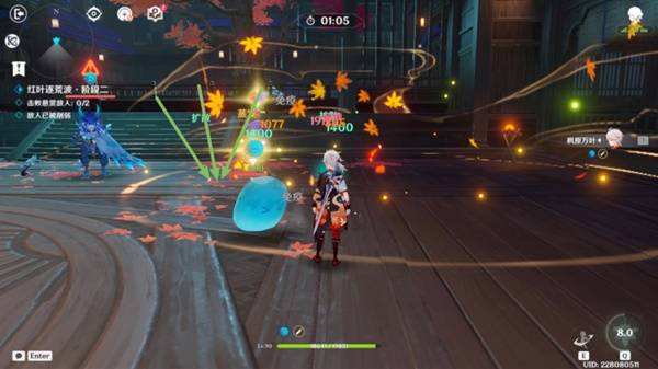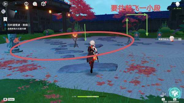 然后开始输出,大招染火如图,控制万叶离角落的距离,可以让大招范围铺展更大,多利用长按战技,把水游侠拉到大招范围裏,站在大招边缘更佳(图中箭头处)