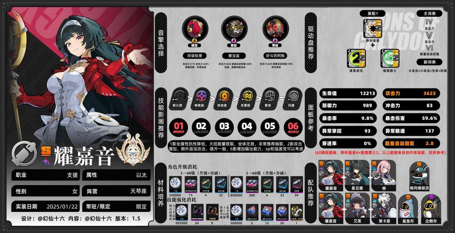 一图流有面板参考、技能升级推荐、音擎推荐、影画选择、驱动盘推荐、配队推荐、材料培养。认真看完一图流相信大家会对耀嘉音培养以及玩法有一个详细的了解。