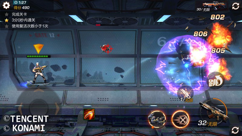 游戏的操作非常简单,左侧是虚拟摇杆,控制角色的左右移动以及下蹲上跳。右侧是行为控制面板,在战斗中对角色发出各项指令,包括射击、技能、跳跃、超级武器四个方面。指挥官需要合理的使用才能在挑战中获得不断的胜利。其中,跳跃指令可以与方向键搭配使用,例如按住向左的方向键和跳跃键,角色就会向前跃进,向下+跳跃键则是从高处下跳。
