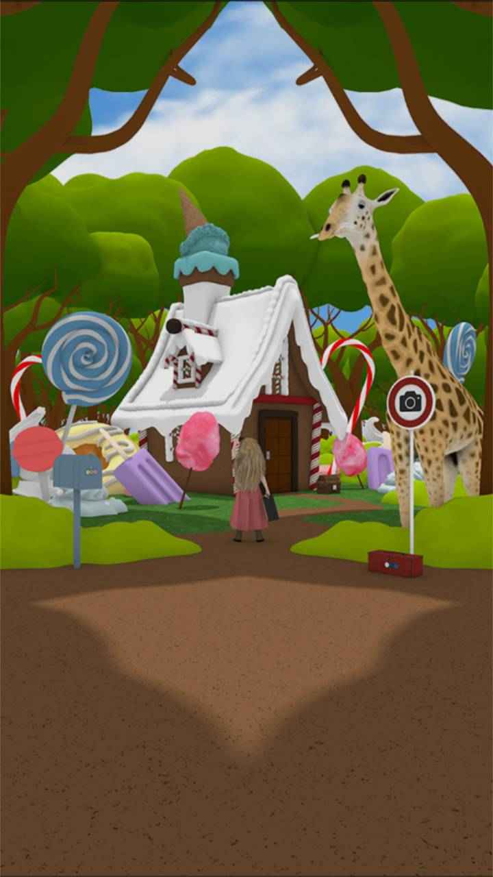 2、格蕾特发现自己在一个充满各种糖果的魔法森林,看起来很好吃的房子,可爱的动物居民,神秘的黑衣女巫;