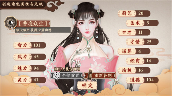 目标:智力800 灵力900 武力200 魅力100 口才70 医术70 绘画60 道德100