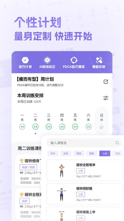 3、用户也可根据实际情况和兴趣选择合适的课程并调整计划来练习,实现针对性增肌塑形