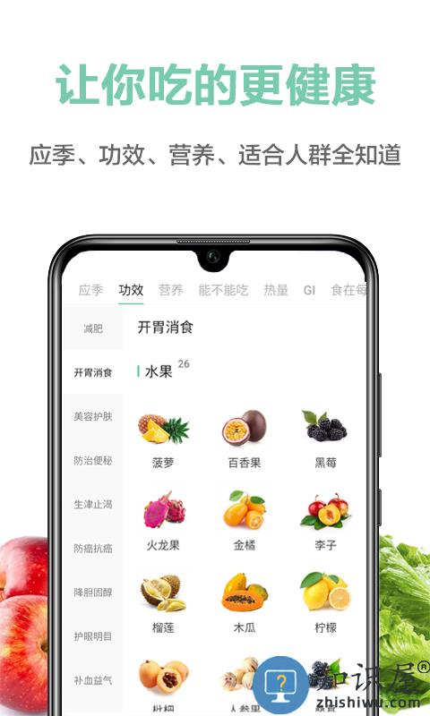 4.健康:提供包含应季、功效、营养、能不能吃、热量、GI、嘌呤、草酸、四性、五味、食在每日11个分类下的果蔬健康饮食指南.