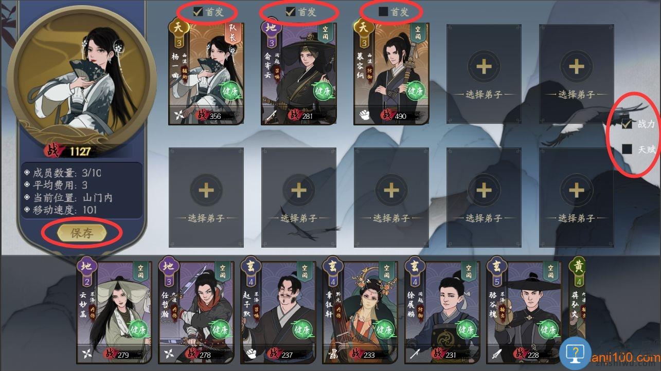 如若需要派遣弟子进行游历,需要于山门处将弟子组成编队才可以哦。山门的位置位于宗门大殿正前方,如若寻找有些困难,可以对照图中位置进行寻找哦。点击山门,选择编队,将需要派遣的侠客拖动至队伍内,选择保存即可。