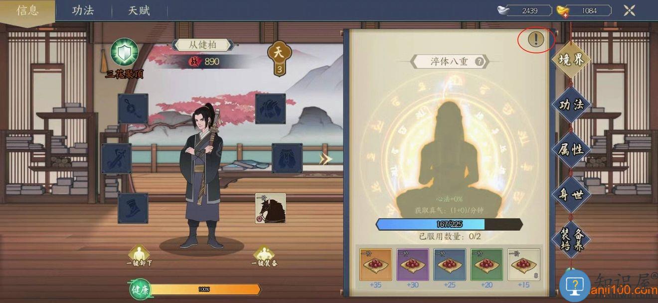 (2)在该界面内,可装备功法,查看属性,身世并对装备进行培养,详细功能介绍诸位掌门可以通过界面中的感叹号进行查看。