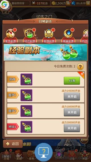 每天有2次免费挑战次数,挑战可获大量英雄经验,挑战的难度越高,经验越多