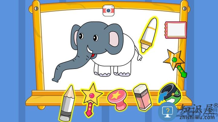 2.图形填色,有5大类图形,动物、家具、建筑、交通工具和植物,可自由在图形上填色上色,并且可以播放动画。
