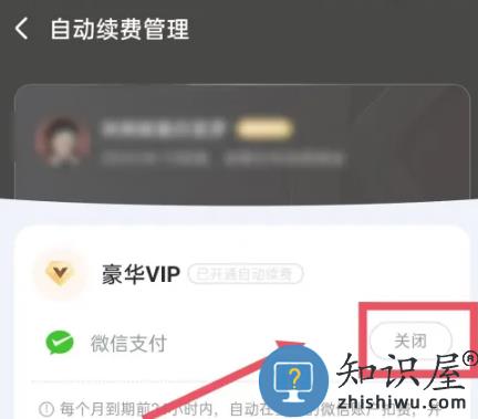 5、最后点击【微信支付】后方【关闭】按钮点击,跳转小窗口【继续关闭】选项点击即可取消续费。