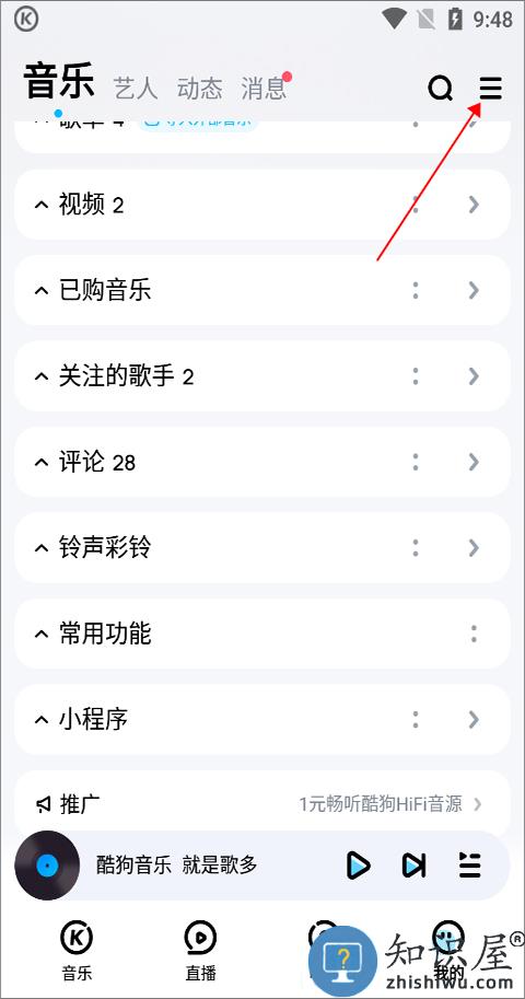 接着前往酷狗音乐app【我的】页面中点击右上角的扩展小图标(下图红色箭头所指)