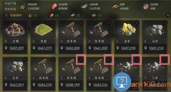 三、提升战力开荒进行到这里的时候,相信领主们对基本流程也有了一定的了解,资源田也占领到了上限。可此时我们的资源田等级都较低,每小时获取的资源量很少,为了更快的发展,我们势必要攻打更高级的资源,把原先的低级田慢慢放弃换新。(点击屏幕上方资源打开领地总览,找到想要放弃的领地,点击‘—’号即可快捷放弃。)