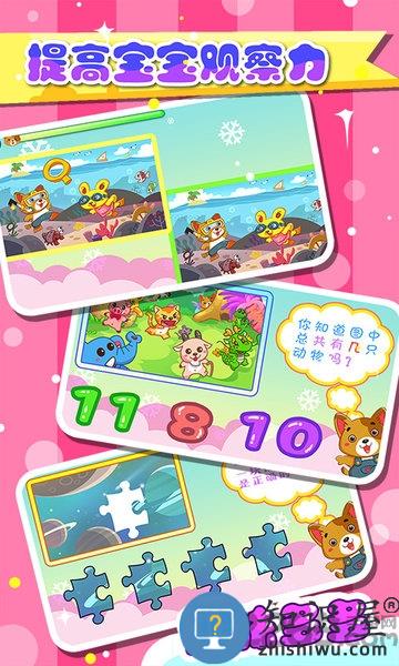 游戏可以用来开发幼儿的智力、提高其认知能力。游戏有4个关卡,每个关卡都有新颖的游戏。游戏内容也很丰富,每个关卡有10个小游戏,一共有40个小游戏。幼儿通过玩游戏获得智力种子来开启更高的关卡,游戏中幼儿还可以获 得称号,大大鼓励儿童,从小树立自信心。