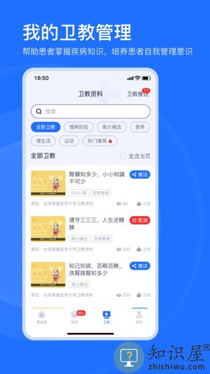 点击推送按钮向广大患者在线推送各种卫教资源,提供知识内容;