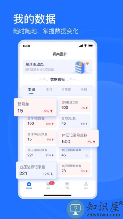 “肾尚医护”结合院内外场景,为医护提供数据查看、患者群管理、咨询、卫教等功能,让医护的慢病管理快速、便捷、高效。