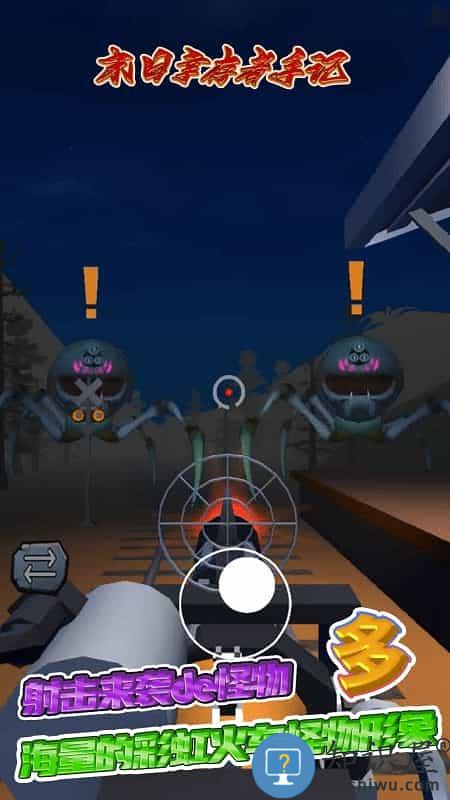 《末日幸存者手记》是一个以恐怖蜘蛛为主题的幸存者射击游戏。你在一个被彩虹蜘蛛入侵的村庄里。你的任务是试图通过火车在这个危险的村庄中生存——这是仅有的一个交通工具。你需要乘火车去车站收集武器和必需品,但火车的噪音吸引了彩虹蜘蛛怪物。你可以从车站的武器库中挑选并射击所有的蜘蛛怪物,收集怪物的蛋来引诱强大的蜘蛛首领。小心怪物蜘蛛,它们吃完后可以变成任何形状。