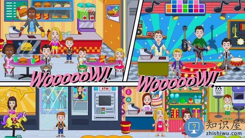 你的城市有很多的场所可以去,去购物中心、电影院、游乐园,去任何想去的地方,这里还有小孩喜欢的宠物店,你可以去购买不同的宠物。