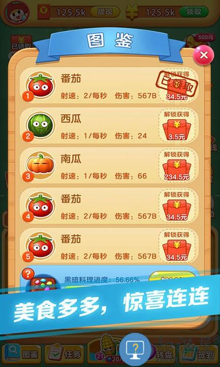 3.合成后会解锁更高级的美食。美食会主动攻击怪物,阻挡怪物的入侵。