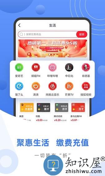 缴费充值,提供各种生活缴费服务包括外卖消费,爱奇艺会员充值等。