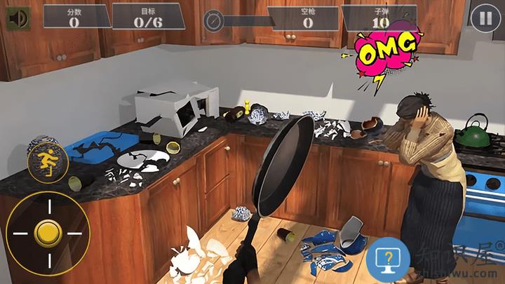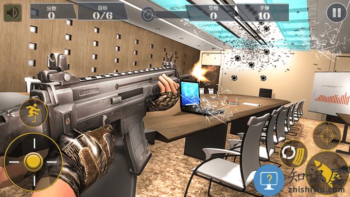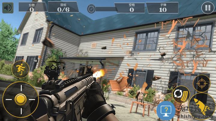 3.游戏中玩家携带一把突击步枪,可以对着眼前的房子肆意破坏,风扇、台灯、监控设备