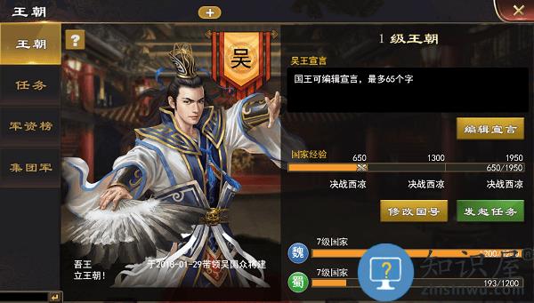 国家等级达到要求时在“国家升级”按钮处出现“建立王朝”按钮,点击升级王朝即可开启升级任务。