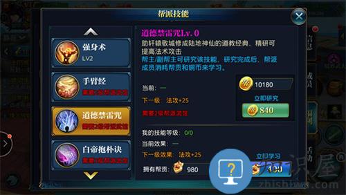 1、 帮派技能:只要有帮派贡献就可以学习帮派技能,帮派技能有很多项根据帮派等级开放, 会 增加成各种不同的属性,有些技能不要点错,看好自己的职业是物理攻击还是法术攻击,不要点错,每一级的帮派技能都可以为你增加很多战力和属性,让你的战力更进一层楼