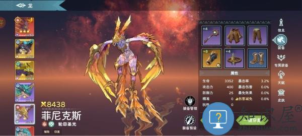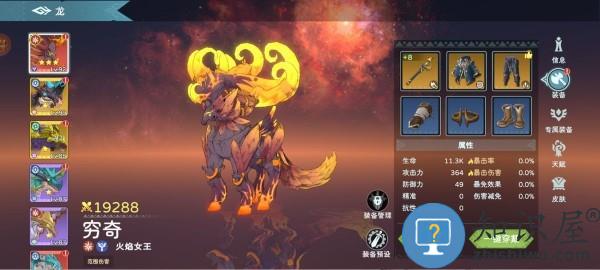 在小龙的升级界面中,有六个黑黢黢的格子(红框),那就是装备栏。每只龙共有六个装备栏,武器、头盔、护腿、胸甲、圣物和专武。而前四种装备中,共有普通、罕见、稀有、神话、传说、史诗六种品质;圣物是从时空幻境爆的;专武在小龙进化到9星后自动解锁,注意了,不是每条龙都有专武的,详细的自己翻翻游戏内图鉴。
