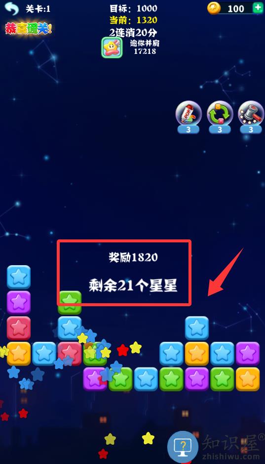 2、恭喜你通关了,点击消灭全部颜色的星星就可以下一关了。