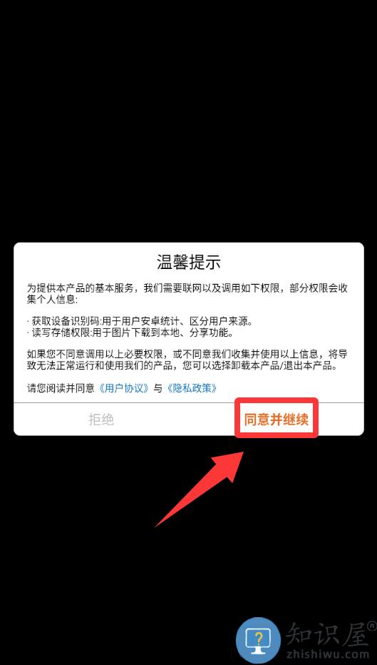 1、点击温馨提示里的同意并继续。
