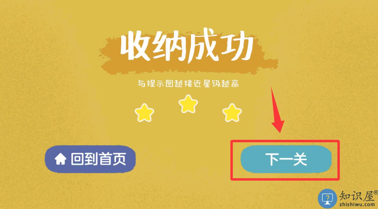 3、恭喜你收纳成功了,点击红色框框里的下一个并继续。