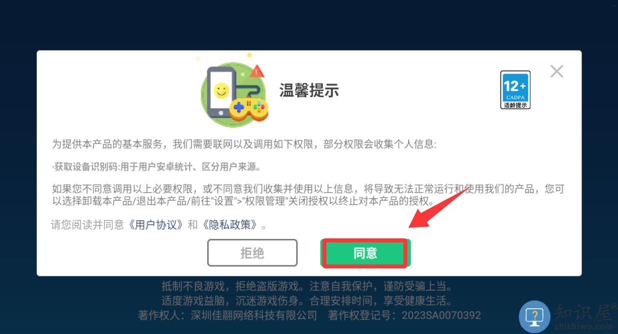 1、点击温馨提示里的同意并进入游戏。