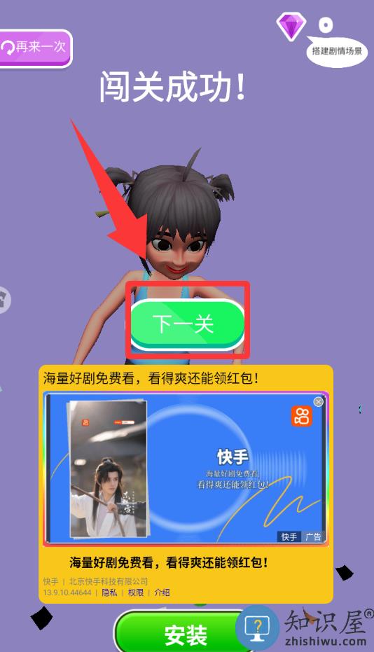 4、恭喜你过关了,点红色框框里的下一个并继续。