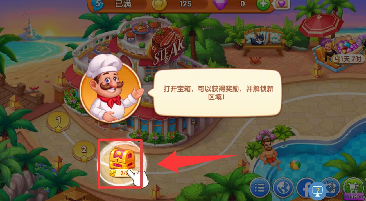 1、进入游戏点击红色框框里的宝箱打开获得奖励。