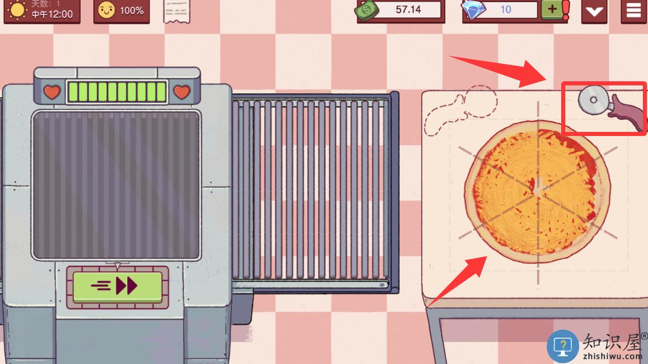 2、然后点击长按红色框框那把刀把披萨切成6块。