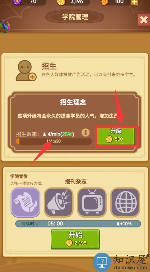 3、点击红色框框里的升级,升级会提高招生率。