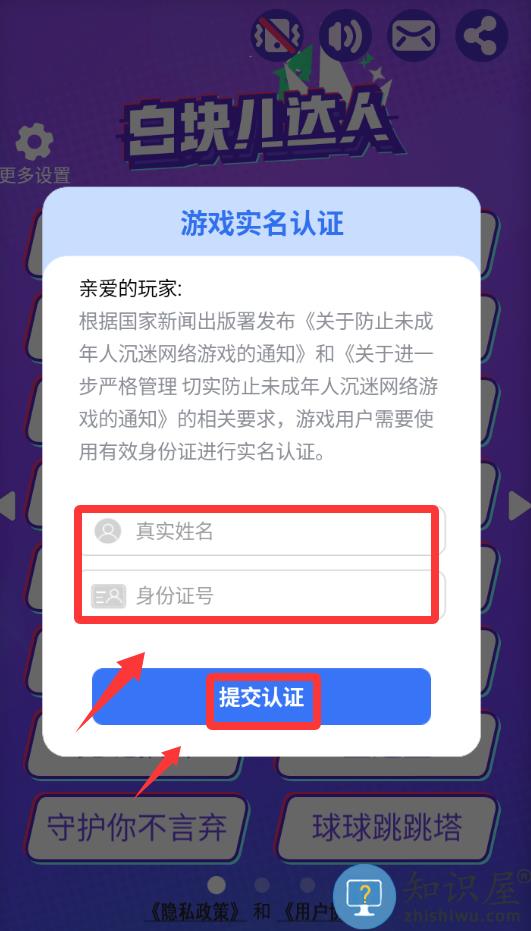 2、进入游戏要实名认证,填写真实姓名和身份证号码并提交。